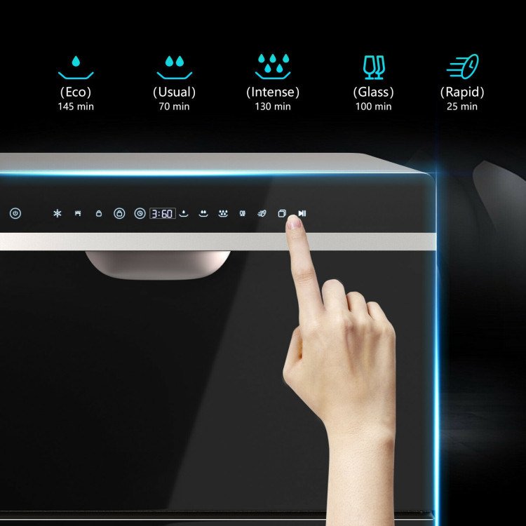4.Safe Operate with 5 Washing Modes: Taking utensil materials and different stains into consideration, this dishwasher offers 5 washing presetting to reach the maximum cleaning effect. The child lock is used to lock the control panel to prevent misoperation by kids or pets. Last but not least, the dishwasher suspends when you open the door during an operation.