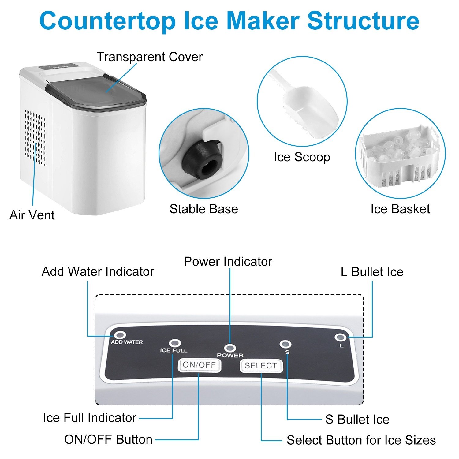 *Considerate Control Panel*:Features 5 indicators,including Add Water Indicator for water shortage warning,Ice Full Indicator for taking out ice,Power Indicator for turning on or off,S or L which offer you 2 available sizes of bullet ice.