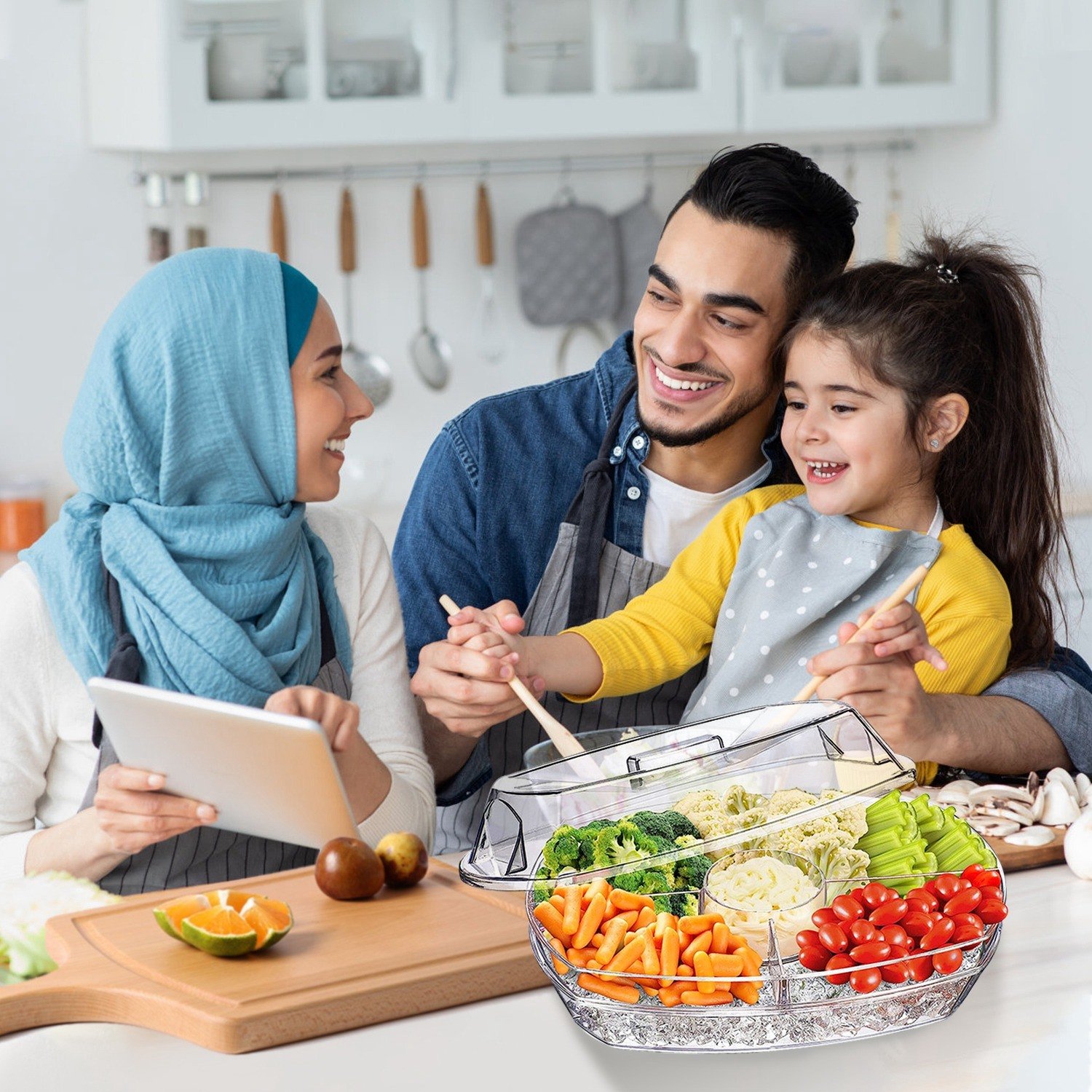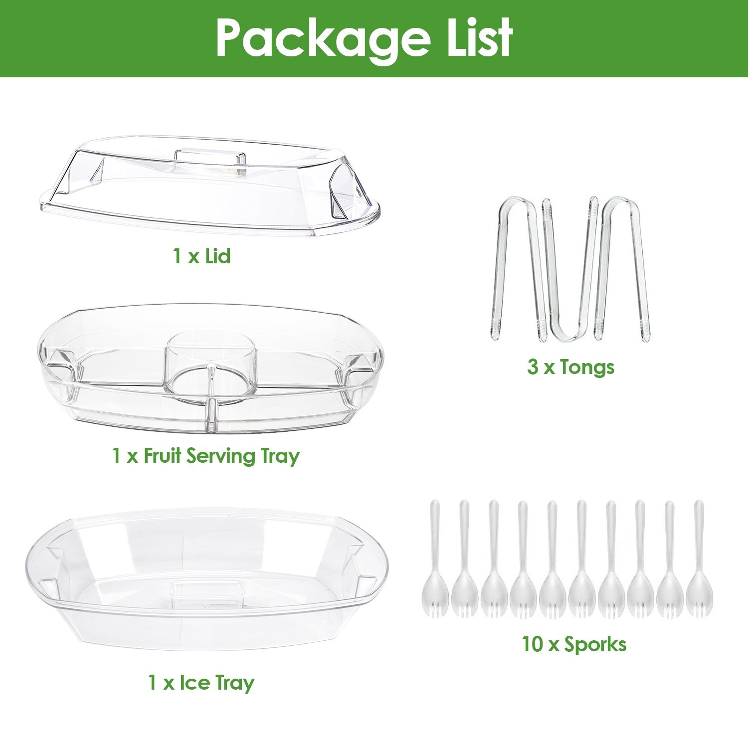 *Keep Fresh*:The Chilled Veggie Tray is a three piece set including a food tray,an ice tray and a lid. Simply put the fruits/food in the divided top tray,fill the bottom tray with ice and cover with the clear lid to keep food cold and fresh,perfect for outdoor parties.