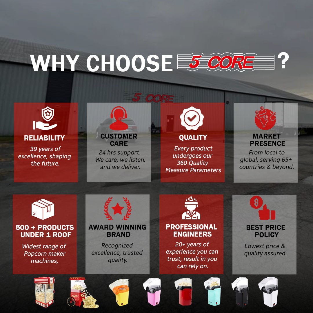Indulge in the irresistible aroma of freshly popped popcorn with the 5 Core air popper popcorn maker. Say goodbye to unhealthy microwave bags and hello to hot; fluffy; and healthier popcorn in minutes. With its high-capacity heating chamber and one-touch start button; this popcorn machine is the perfect addition to your kitchen; whether you're hosting a movie night with friends or snacking on the couch.