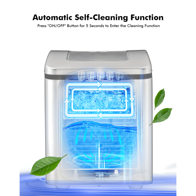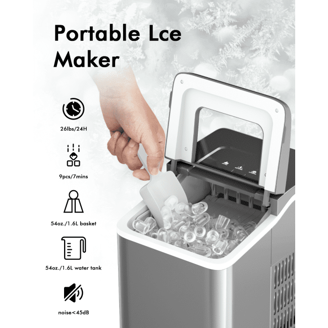 Produces 9 chewable bullet-shaped ice in 8 minutes for fast ice-makingMakes 26 lbs of ice each day, meeting your daily ice needsSelf cleaning function maker it convenient to clean and maintainSimple control panel for easy operationFood grade material, harmless to human bodyChecks the progress and amount of ice easily with transparent lidWill not disturb your entertainment with 45dB low noise operationConvenient to carry and store with portable and compact designSuitable for home, office, party and barTakes out the ice with ease thanks to included scoop and removable basketETL and UL certificated for safer use