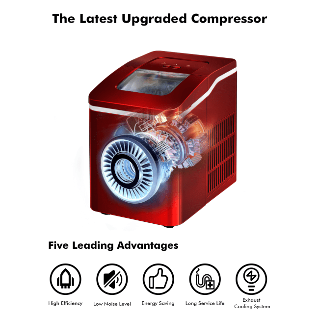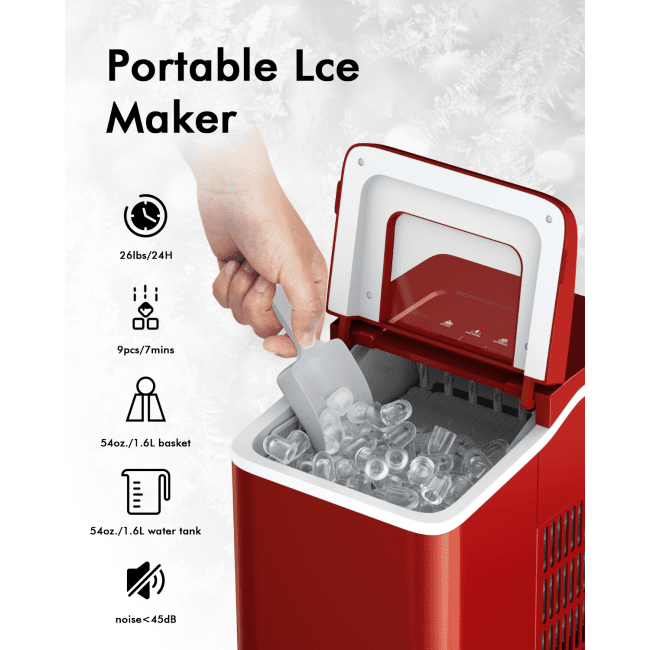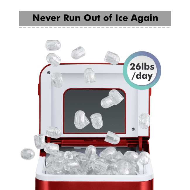Produces 9 chewable bullet-shaped ice in 8 minutes for fast ice-makingMakes 26 lbs of ice each day, meeting your daily ice needsSelf cleaning function maker it convenient to clean and maintainSimple control panel for easy operationFood grade material, harmless to human bodyChecks the progress and amount of ice easily with transparent lidWill not disturb your entertainment with 45dB low noise operationConvenient to carry and store with portable and compact designSuitable for home, office, party and barTakes out the ice with ease thanks to included scoop and removable basketETL and UL certificated for safer use