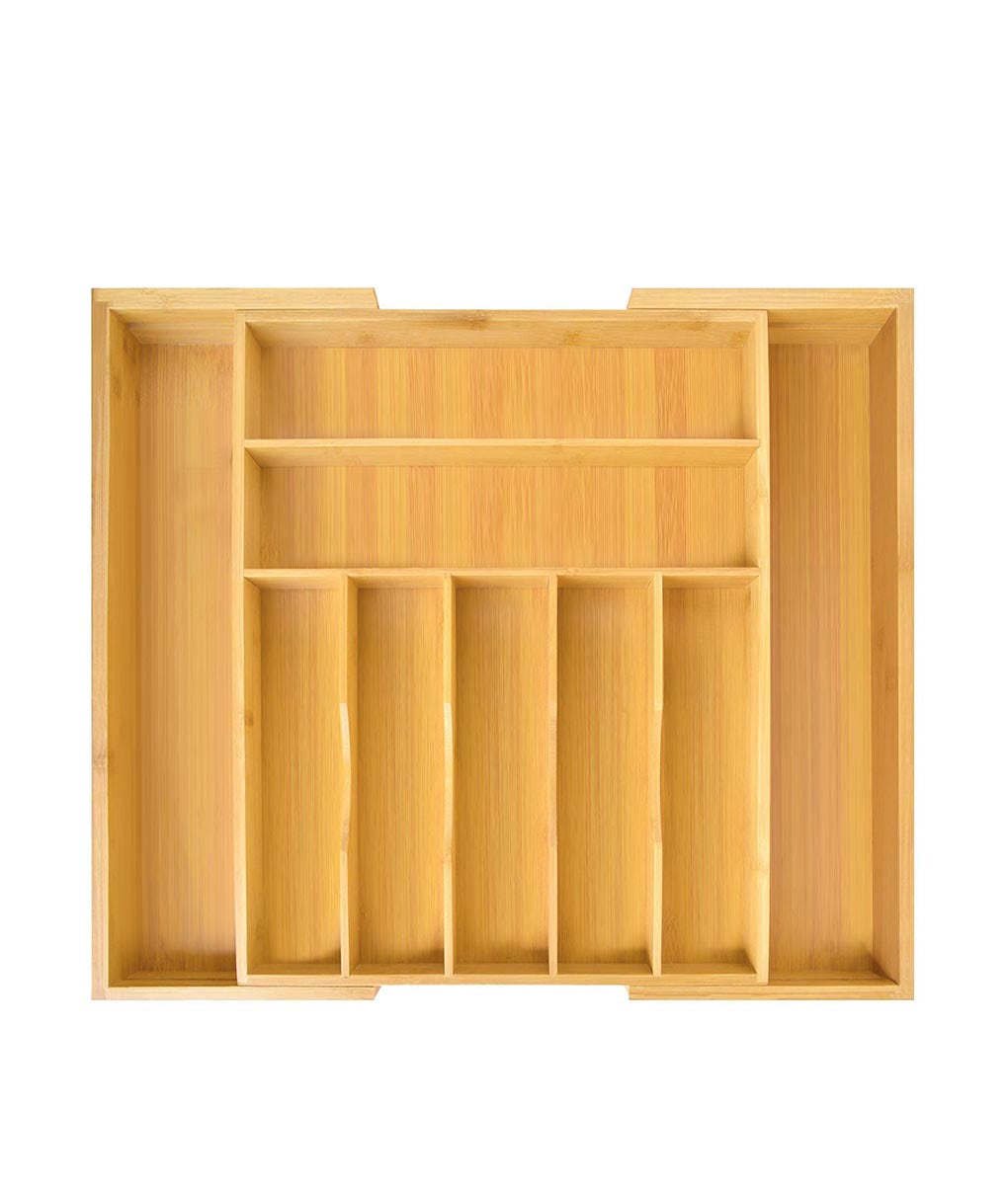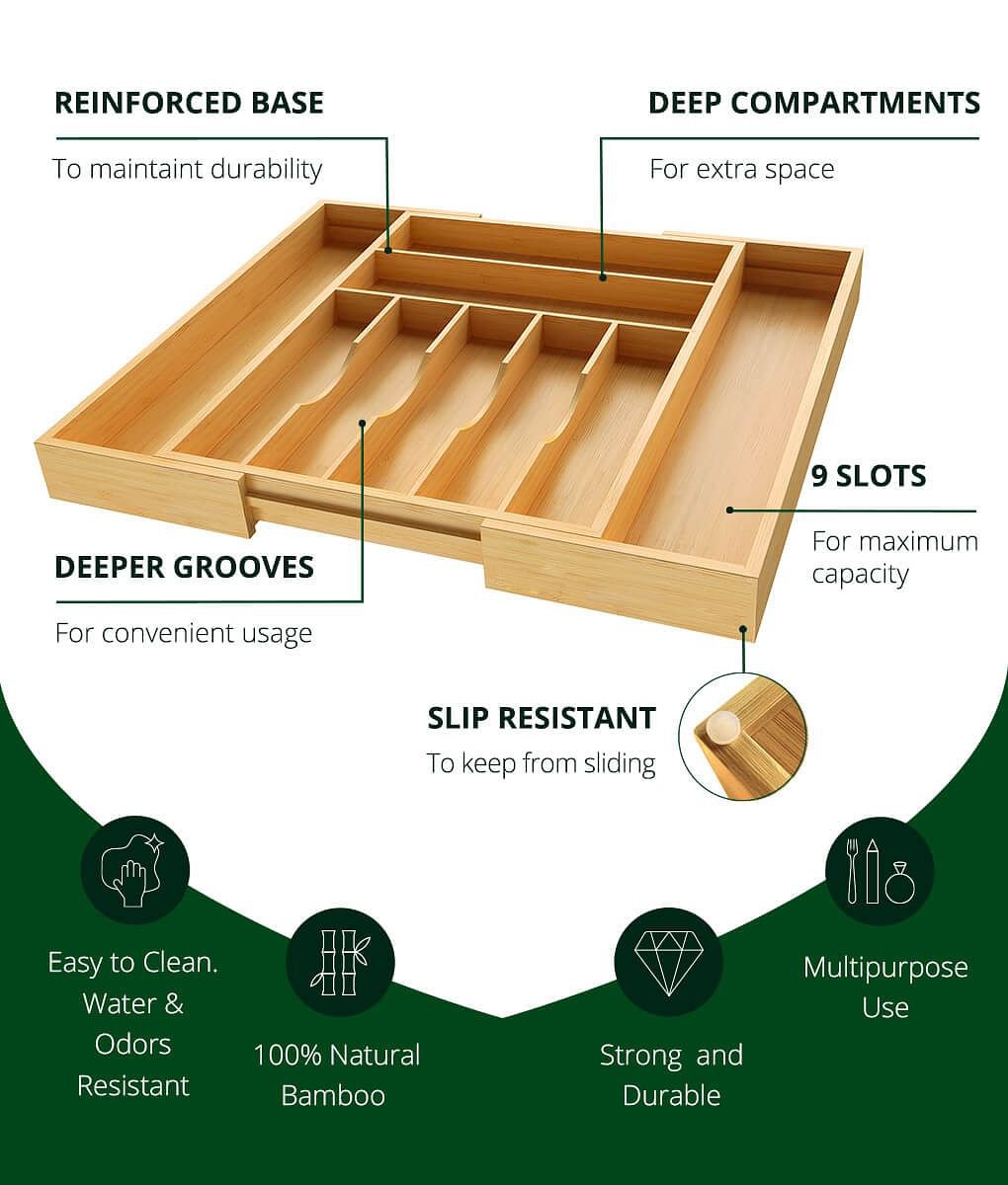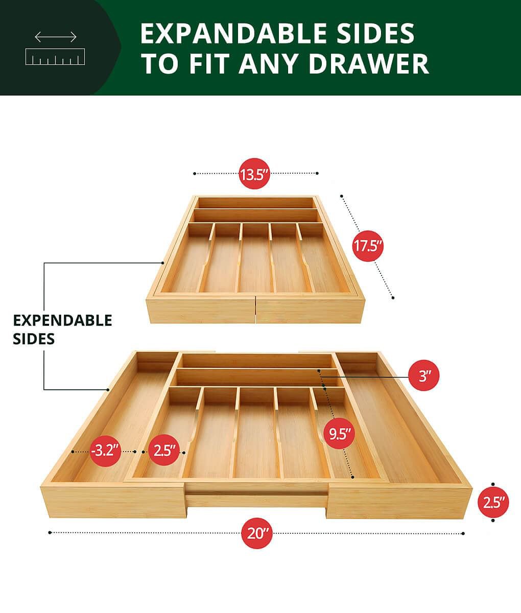 Practical Storage Space Separate and store cutlery, kitchen gadgets, utensils and more with nine compartments to accommodate any drawer storage needs. This can reduce clutter and avoid desperately searching for lost items. Ensure drawers in the kitchen and beyond are neat and organized. Extra Large Size Perfect for Utensils the drawer organizer provides seven compartments, and it can be easily expanded to nine compartments by simply sliding out the left and ride sides of the unit. At 16.06 inches long and 12.52 inches wide at full, the stretched width is 21.12 inches.This organizer is perfect for large utensils, gadgets and cutlery. This organizer is perfect for large utensils, gadgets and cutlery. Made of eco-friendly wood bamboo, healthy and durable, easy to clean.