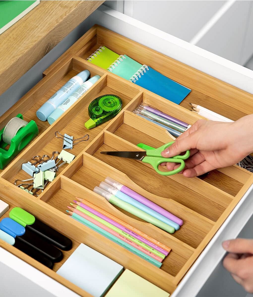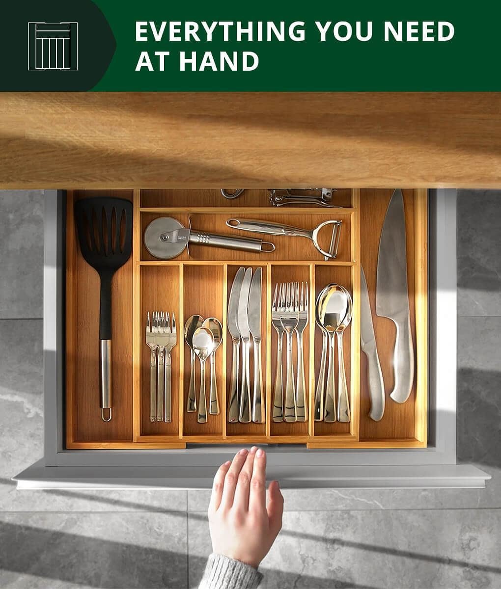 STORE AND ORGANIZE WITH A PEACE OF MIND: This silverware drawer organizer includes adjustable storage slots, making it an ideal storage solution for culinary tools and tableware. Organize your silverware, serving ware, and utensils in the kitchen in a method that makes the most sense to you. It features deep, 2.5' storage sections and expands from 13.5' to 20' wide for customizable use. Adaptable to your needs, our bamboo drawer organizer grows from 7 to 9 sections for a cleaner appearance, making it easier to see and access whatever you need.