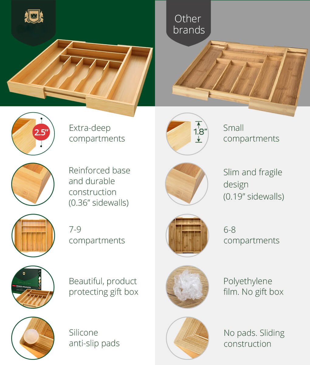 ECO & SAFE MATERIAL: We constructed our kitchen drawer dividers with 100% organic bamboo. Food-safe finish on all surfaces. And unlike other manufacturers, our bamboo organizers are harvested at full maturity to increase durability and strength. For you, that means this our organizer might just last longer than your drawer.