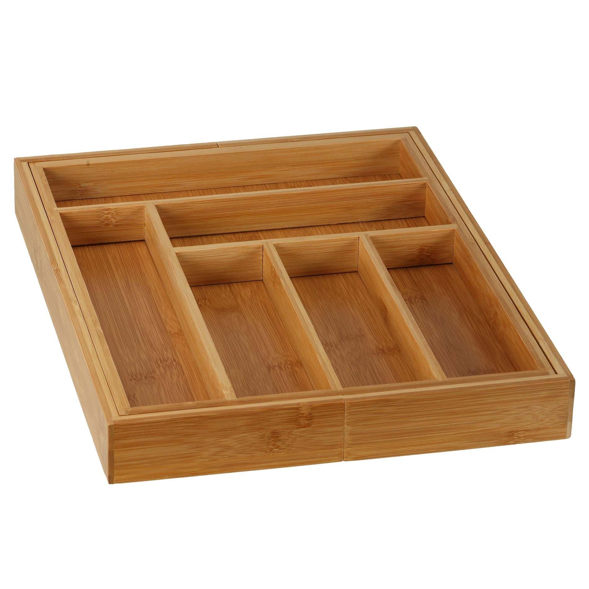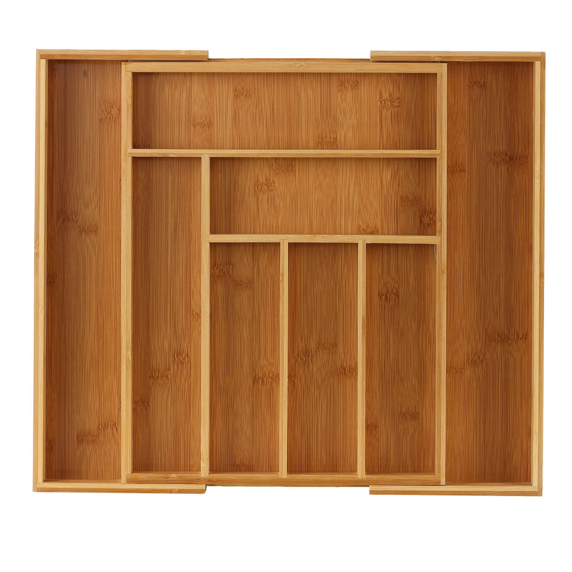 Practical Storage Space Separate and store cutlery, kitchen gadgets, utensils and more with nine compartments to accommodate any drawer storage needs. This can reduce clutter and avoid desperately searching for lost items. Ensure drawers in the kitchen and beyond are neat and organized. Extra Large Size Perfect for Utensils the drawer organizer provides seven compartments, and it can be easily expanded to nine compartments by simply sliding out the left and ride sides of the unit. At 16.06 inches long and 12.52 inches wide at full, the stretched width is 21.12 inches.This organizer is perfect for large utensils, gadgets and cutlery. This organizer is perfect for large utensils, gadgets and cutlery. Made of eco-friendly wood bamboo, healthy and durable, easy to clean.