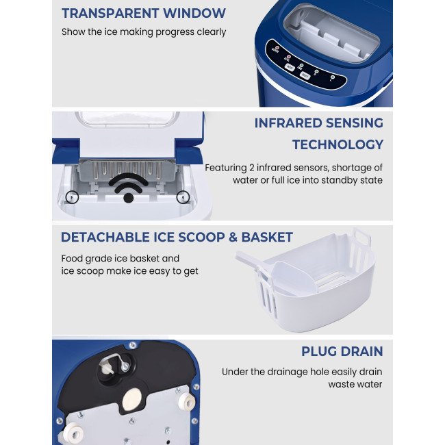 Equipped with a powerful compressor and 9 evaporator columnsWith a 2.2 L water tank, 9 ice cubes will be made within 6-13 minutesCan make up to 26 lbs ice in 24 hoursThe giant ice storage capacity of 1.5lbs Intelligent function with ice-full indicator and water shortage indicatorThe water level mark suggests the right water height and ensures regular useEvaporator column of the nickel-plated surface with R134a refrigerantAutomatic shut-off function when ice basket fullTransparent viewing window, removable ice basket and ice scoopClear control panel, easy to useTransparent windows provide an excellent view to look insideRound and smooth ice, don't hurt mouthHollow Design for better use Big and small size available for different useCan cool drinks, food and make fruits smoothies and moreHelpful for medical treatment and first aid Portable and compact, easy to carryA wide range of personal and commercial use 55 DB low operating noiseFood grade material ensures the safety and healthy ETL certified and FDA certified