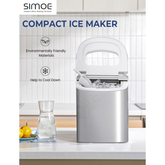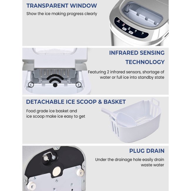 Equipped with a powerful compressor and 9 evaporator columnsWith a 2.2 L water tank, 9 ice cubes will be made within 6-13 minutesCan make up to 26 lbs ice in 24 hoursThe giant ice storage capacity of 1.5lbs Intelligent function with ice-full indicator and water shortage indicatorThe water level mark suggests the right water height and ensures regular useEvaporator column of the nickel-plated surface with R134a refrigerantAutomatic shut-off function when ice basket fullTransparent viewing window, removable ice basket and ice scoopClear control panel, easy to useTransparent windows provide an excellent view to look insideRound and smooth ice, don't hurt mouthHollow Design for better use Big and small size available for different useCan cool drinks, food and make fruits smoothies and moreHelpful for medical treatment and first aid Portable and compact, easy to carryA wide range of personal and commercial use 55 DB low operating noiseFood grade material ensures the safety and healthy ETL certified and FDA certified