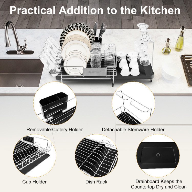 Perfect kitchen addition to hold different utensilsAutomatic drainage sends the water directly into the sinkSpout can be positioned on any side of the drainboardExpand to store more utensils and retract to save spaceCutlery holder is removableStainless steel frame ensures durabilityAnti-slip foot pads make the dish rack stand more evenly on the counterEasy to separate and clean all the parts