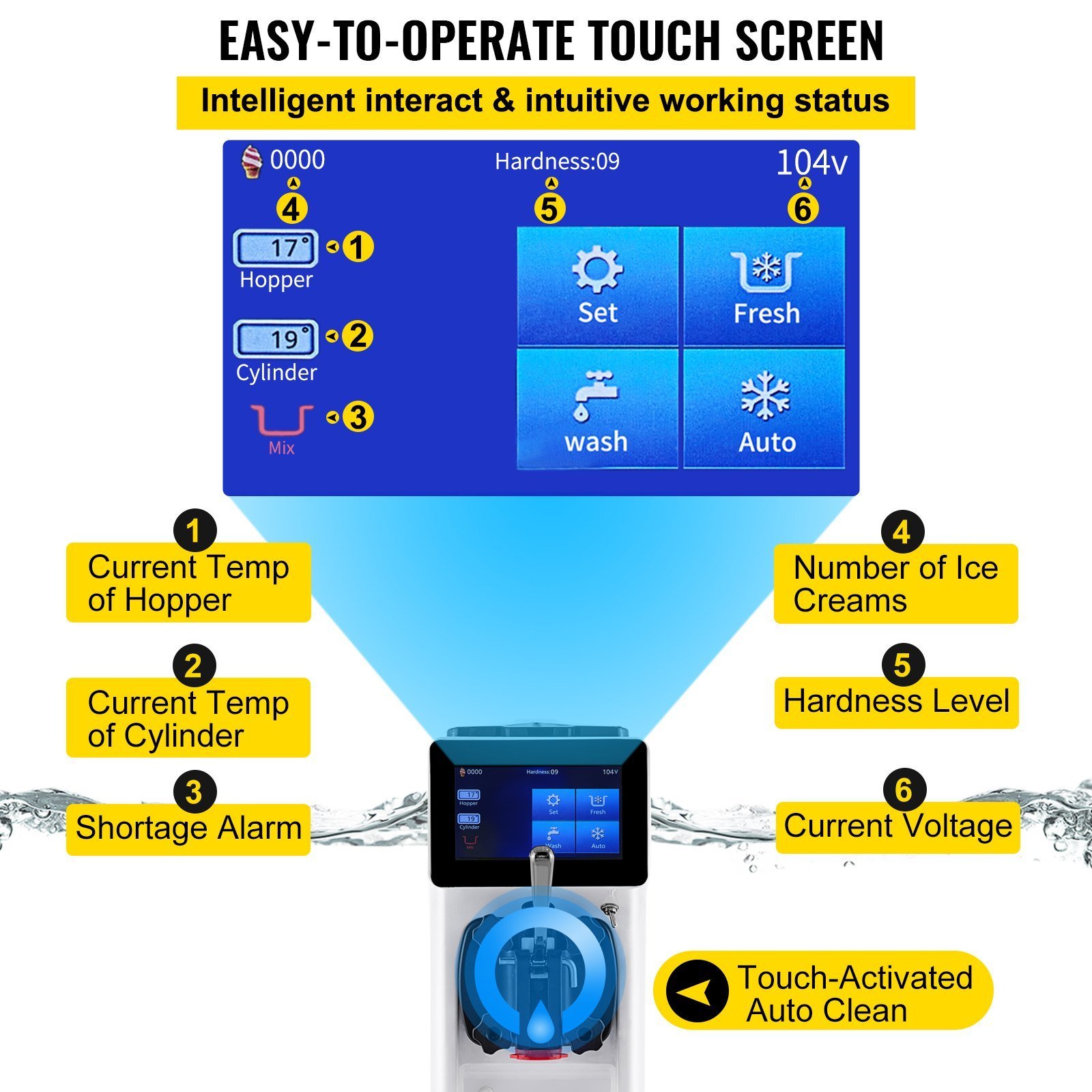 2.Smart Touch Panel Control: Our soft serve ice cream maker features an extra-large touch screen. The screen shows the current temp of the hopper & cylinder, allowing you to make prompt adjustments when needed. Quantity, hardness level, and voltage are also directly displayed. The shortage alarm function will remind you to add more ingredients to the mixing hopper. Plus, self-cleaning can be activated just with one click.